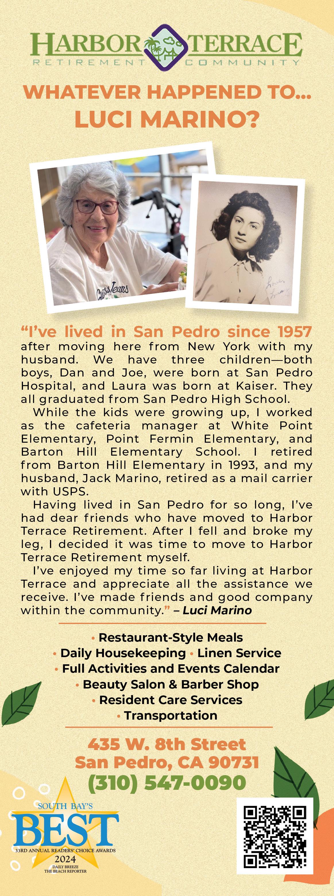 Violet worked at Douglas Aircraft in El Segundo before marrying and having children, Marilyn and Kathy. She married a longshoreman, a Croatian immigrant, and rarely felt the need to leave town for anything. She looked forward to the monthly “Moonlight Sales” along Pacific Avenue. Among her favorite stores were Lewis’, Hartfield’s, Lilyan’s, Al Murray’s, Lad’N Lassie, The Bunny Shop, and Newberry’s. La Rue Pharmacy soda fountain was an occasional treat. Our mom would tell us stories about ‘old San Pedro,’ including watching live chickens run around with their heads cut off at Slavko’s Poultry!