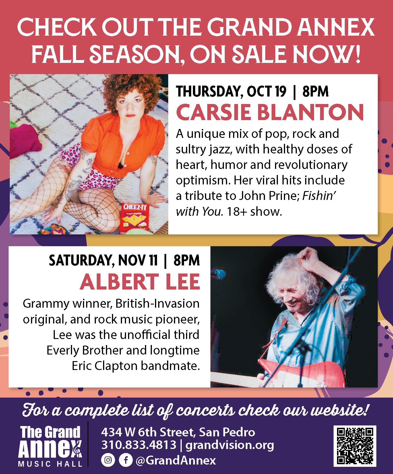 3 (Thurs) – FIRST THURSDAY ARTWALK AND GUIDED TOUR at Pixels Gallery (439 W. 6th St.), 5:30p. – Join local artists and creatives for a tour of the San Pedro Arts District. We will gather at 5:30p at Pixels Gallery, walk at 6p, and end the tour at fINdings Art Center (443 W. 6th St.). Along the way, we will visit the “Ojo de la Sirena” mural by Virginia Broersma at Sirens Java & Tea (402 W. 7th St.). The band performing on the corner of 6th and Mesa will be Carly & the Universe, and The Food Truck Alley will return to Mesa St. between 7th and 5th streets. You can park at 6th and Harbor Blvd. and take the red PBID trolley to the center of the ArtWalk. For tickets and more info, visit sanpedrowaterfrontartsdistrict.com.