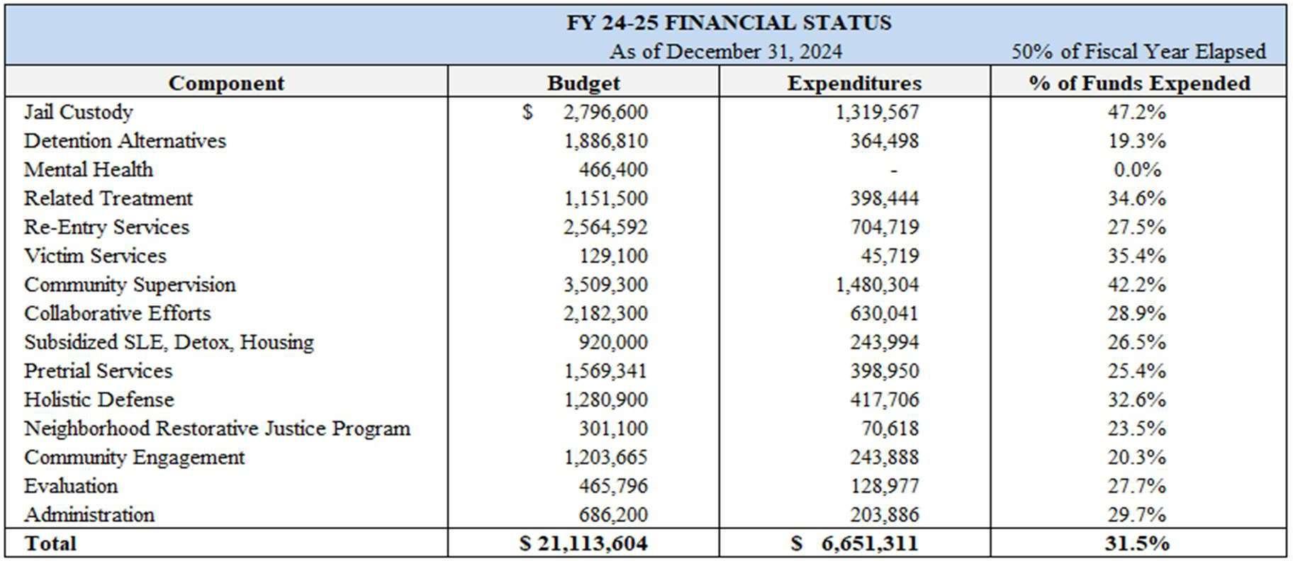 The proposed FY 2025-2026 budget of more than $20 million demonstrates alignment with the CCP efforts which focus on jail population management, pretrial services, alternative sentencing, case management, supervision, treatment services and support for Realigned clients.