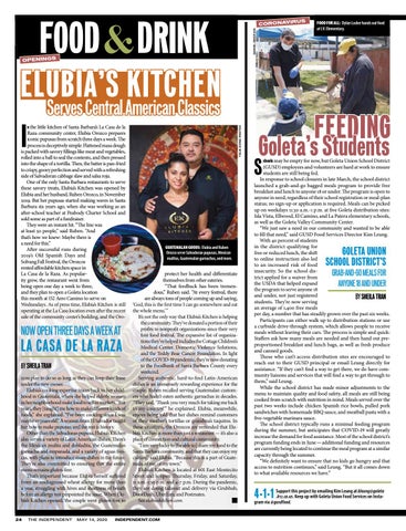 protect her health and differentiate themselves from other eateries. “That feedback has been tremendous,” Ruben said. “At every festival, there are always tons of people coming up and saying, ‘God, this is the first time I can go somewhere and eat the whole menu.’ ” It’s not the only way that Elubia’s Kitchen is helping the community. They’ve donated a portion of their profits to nonprofit organizations since their very first food festival. The expansive list of organizations they’ve helped includes the Cottage Children’s Medical Center, Domestic Violence Solutions, and the Teddy Bear Cancer Foundation. In light of the COVID-19 pandemic, they’re now donating to the Foodbank of Santa Barbara County every weekend. Serving authentic, hard-to-find Latin-American dishes is an immensely rewarding experience for the couple. Ruben recalled serving Guatemalan customers who hadn’t eaten authentic garnachas in decades. “They said, ‘Thank you very much for taking me back to my country,’ ” he explained. Elubia, meanwhile, enjoys being told that her dishes remind customers of their mother’s tortillas or grandma’s taquitos. In these situations, the Orozcos are reminded that Elubia’s Kitchen is more than just a restaurant — it’s also a place of connection and cultural community. “I am very lucky to [be able to] share my food to the Santa Barbara community, and that they can enjoy my culture,” said Elubia. “Because this is a part of Guatemala, of me, of my town.” Elubia’s Kitchen is located at 601 East Montecito Street and is open Thursday, Friday, and Saturday, 11 a.m.-1:30 p.m. and 4-7 p.m. During the pandemic, they are doing takeout and delivery via Grubhub, DoorDash, UberEats, and Postmates. n See elubiaskitchen.com.
