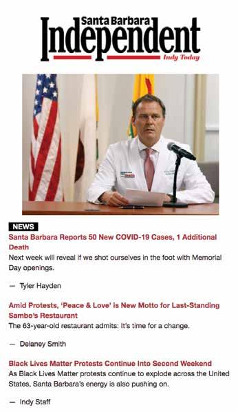 Founding Staff Emeriti Audrey Berman, George Delmerico, Richard Evans, Laszlo Hodosy Honorary Consigliere Gary J. Hill IndyKids Bella and Max Brown, Elijah Lee Bryant, Amaya Nicole Bryant, William Gene Bryant, Henry and John Poett Campbell, Emilia Imojean Friedman, Finley James Hayden, Madeline Rose and Mason Carrington Kettmann, Norah Elizabeth Lee, Izzy and Maeve McKinley Print subscriptions are available, paid in advance, for $120 per year. Send subscription requests with name and address to subscriptions@independent.com. The contents of the Independent are copyrighted 2022 by the Santa Barbara Independent, Inc. No part may be reproduced without permission from the publisher. The publisher assumes no responsibility for unsolicited material. A stamped, self-addressed envelope must accompany all submis sions expected to be returned. The Independent is available on the internet at independent.com. Press run of the Independent is 40,000 copies. Audited certification of circulation is available on request. The Independent is a legal adjudicated newspaper court decree no. 157386. Contact information: 1715 State Street, Santa Barbara, CA 93101 PHONE (805) 965-5205; FAX (805) 965-5518 EMAIL news@independent.com,letters@independent.com,advertising@independent.com Staff email addresses can be found at independent.com/about-us TABLE of CONTENTS volume 36 #879, Nov. 17- 23, 2022 NEWS........................... 9 OPINIONS..................... 15 Angry Poodle Barbecue 15 Letters 17 In Memoriam 21 OBITUARIES 16 THE WEEK 29 LIVING........................ 33 FOOD & DRINK ............. 37 Restaurant Guy 39 ARTS LIFE 41 ASTROLOGY 45 CLASSIFIEDS 46 ON THE COVER: Design by Xavier Pereyra. Cover story