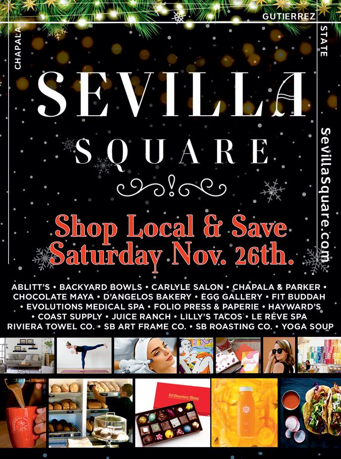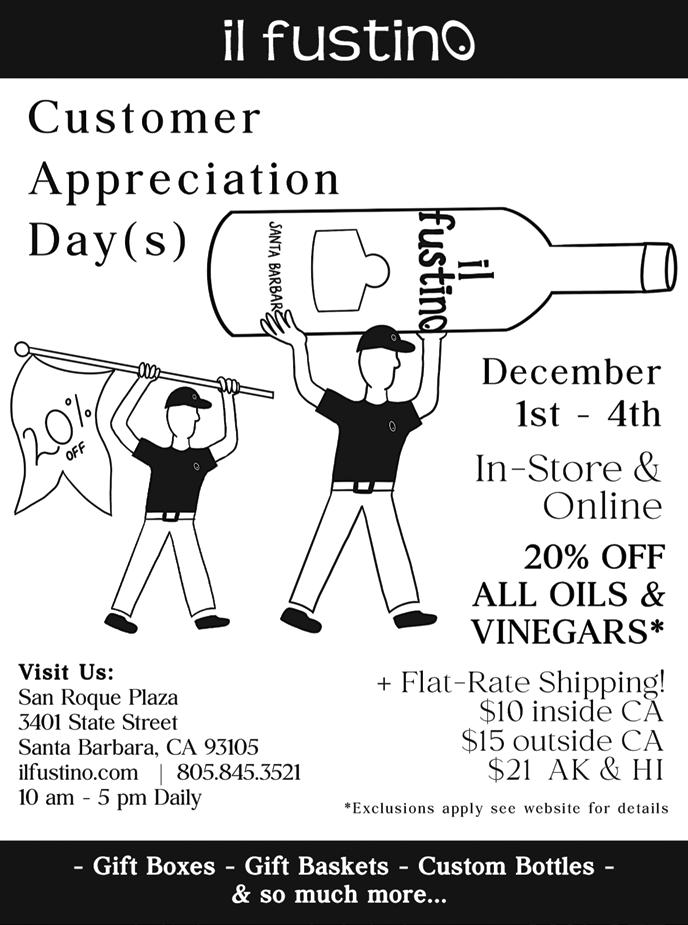 CELEBRATE Thanksgiving Price subject to 8.75% sales tax and 20% service charge. 13.1% of service charge is gratuity for servers, 6.9% covers discretionary administrative costs for the resort. For more information, scan the QR code. To make a reservation, please call (805) 884- 8526 or email SBAFP_SpecialEvents@Hilton.com Thanksgiving Buffet Adults $115 | Children $50 Seating: 11:00am - 4:00pm Gather and give thanks this Thanksgiving at the Hilton Santa Barbara Beachfront Resort La Arcada Plaza - 1114 State Street at Figueroa Bring the family for holiday fun and merriment! 27th Anniversary • Photos with Santa • Holiday Music and Carolers • Fresh-Popped Popcorn • A Chance of Snow Flurries • Lots of Holiday Goodies Wednesday, Nov. 30, 2022 5:00 pm - 8:00 pm Christmas Walk LaArcadaSantaBarbara.com • Ace Rivington • Andersen’s Bakery • Barbieri & Kempe Wines • Catherine Gee • Coast 2 Coast Collection • Field Trip • Gallery 113 • Hook & Press • La Tavola • Lewis and Clark • Lucky Puppy Optical • Mizza • Petit Valentien • Renaissance Consignment • Salon U • SBMA Museum Store • State & Fig • The Barber Shop • The Crafter’s Library • Urban Optics • Waterhouse Gallery • YES Store • 1114 Sports Bar & Games La Arcada Plaza