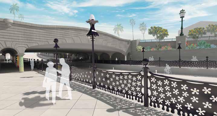 The undercrossing will have a new look, with brightly colored tiles adorning the columns along the walkway, designed by renowned Santa Barbara architect Jeff Shelton, as well as new light posts and custom ironwork railings with flower-shaped cutouts along the sides designed by his brother David.