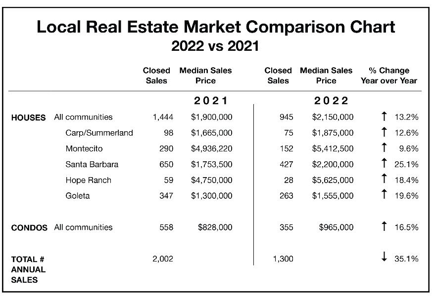 Data for this article was compiled for January through December 2022 by the Santa Barbara Multiple Listing Service and analyzed by members of the S.B. Assoc. of Realtors’ Statistical Review Committee. Writer Sue Irwin is a Realtor with Berkshire Hathaway HomeServices who is celebrating her 20th year in real estate this year. Contact her at (805) 705-6973 or sueirwinrealtor@gmail.com.