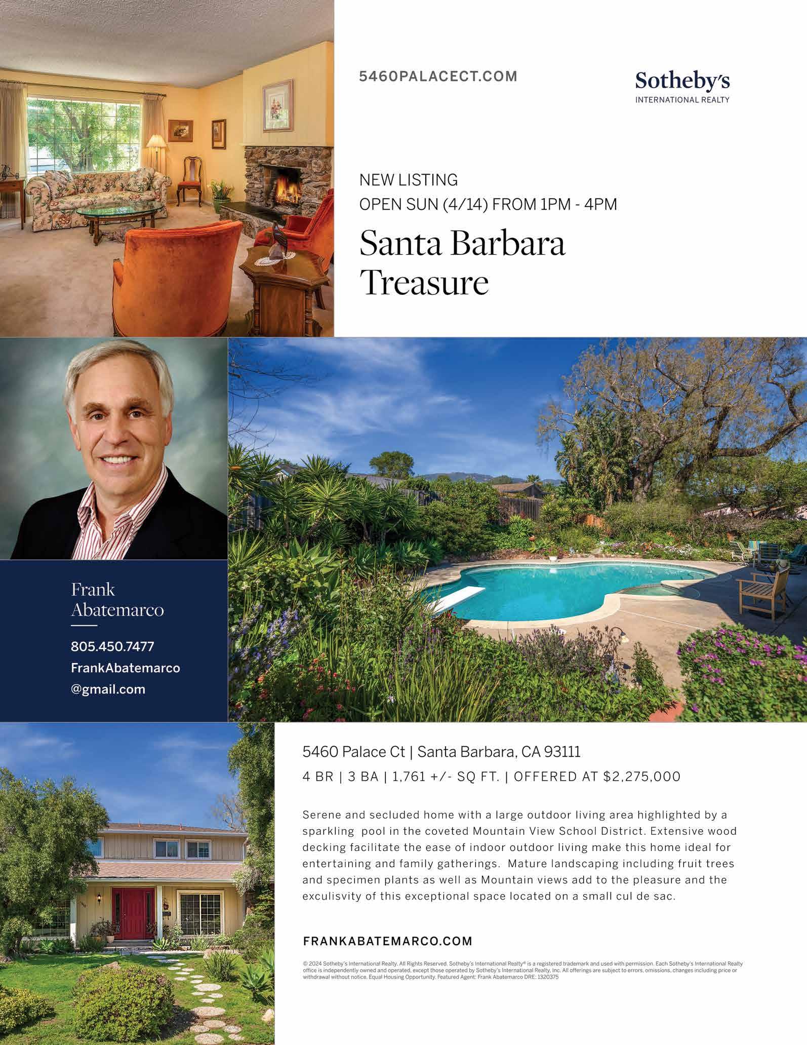 5460 Palace Court, 4BD, 3BA, Sun 1-4, $2,275,000, Sotheby’s International Realty, Frank Abatemarco 805-450-7477, DRE#01320375