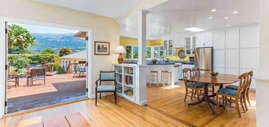 This delightful California cottage features breathtaking mountain views from the living room, kitchen, and large rear deck. Remodeled in 2005, the home offers hardwood floors, dual-paned windows, skylights, and updated baths, blending charm with modern convenience. The spacious living room and dining area have high ceilings and French doors that open to the deck, creating an open and airy feel. The modern chef's kitchen boasts a center butcher-block island.