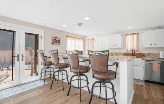 The gourmet kitchen is equipped with state-of-the-art Thermador appliances, Quartz countertops, and a large island with seating and built-in beverage refrigerator. Custom Kemper cabinets throughout the home offer ample storage, while newly designed closets and ceiling fans in each bedroom add a touch of refined practicality.