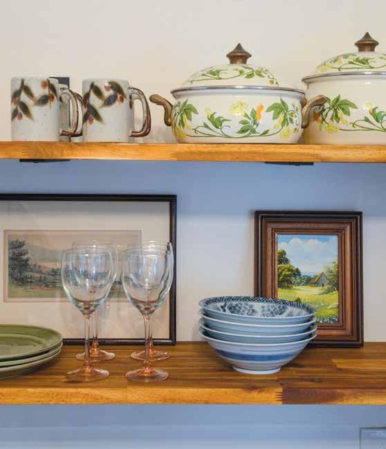 Style Open Shelving with Intention: After you edit, the first rule to styling open shelving is to take everything off and be ruthless about what makes the cut when putting it back together. Play with height: Place objects on a stack of books, lean small art behind items for visual interest, and cluster like items such as candlesticks into groups of three. The rule of thumb for open shelving is to keep it sparse and keep it balanced.