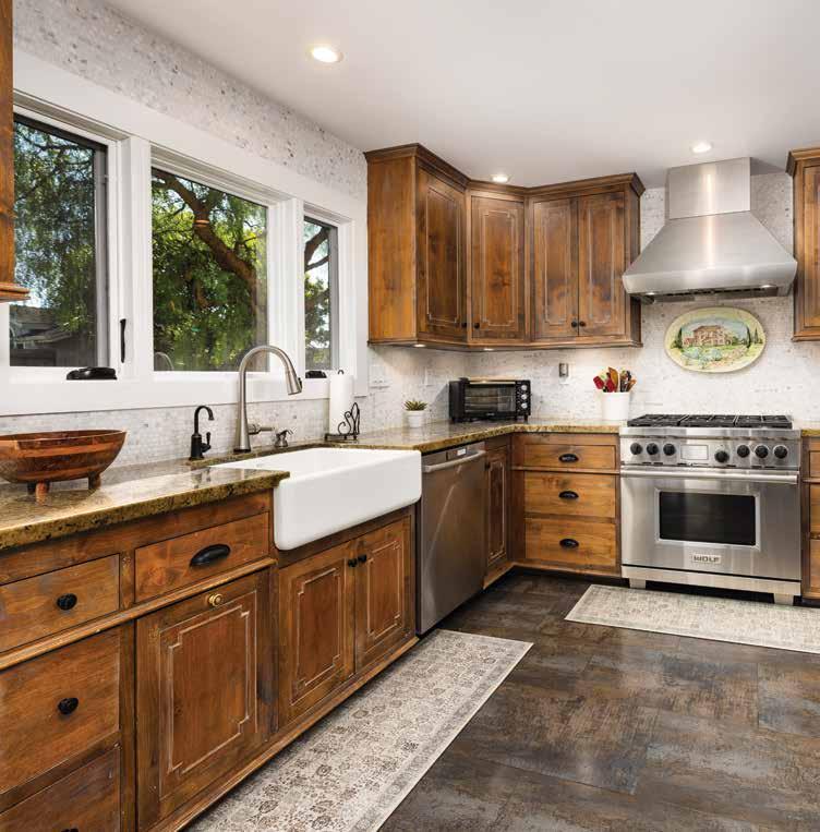 in 1982 and remodeled in 1998, this 3,000-squarefoot residence revealed structural deficiencies when it was opened up during the installation of interior fire sprinklers. From there, the project took off, resulting in a comprehensive remodel and home-automation system across the entire original footprint and into reimagined outside living spaces. Highlights include a water walkway approach, concealed appliances, heated kitchen island countertop, new fireplace, and an outdoor sandstone kitchen overlooking a vanishing-edge swimming pool. The completed project brought modern clean lines to a Spanish-style family home. Architectural design by Britt
