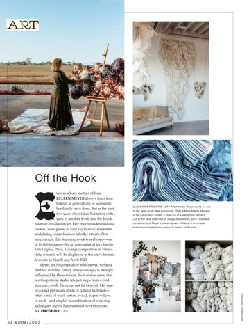 Meyer, an Arizona native who moved to Santa Barbara with her family nine years ago, is strongly influenced by the outdoors. So it makes sense that her Carpinteria studio sits just steps from a bird sanctuary, with the ocean not far beyond. Her oneof-a-kind pieces are made of natural materials— often a mix of wool, cotton, wood, paper, willow, or reed—and employ a combination of weaving techniques Meyer has mastered over the years.