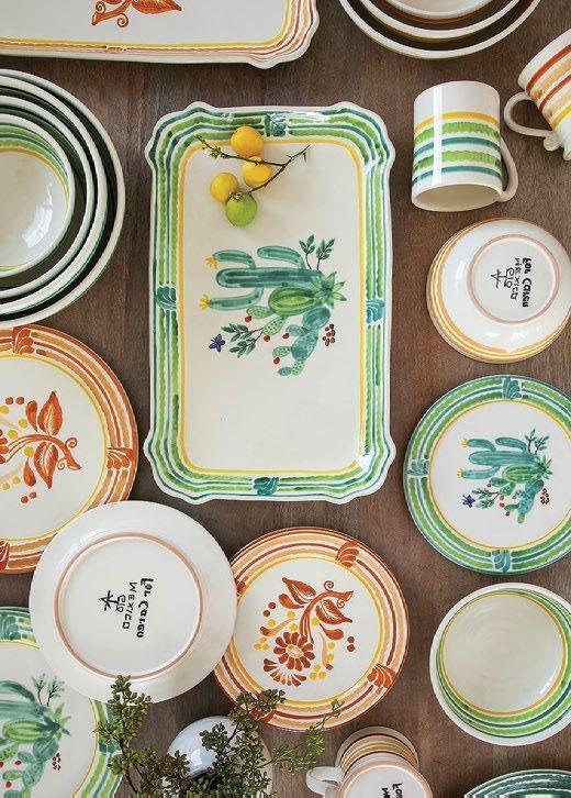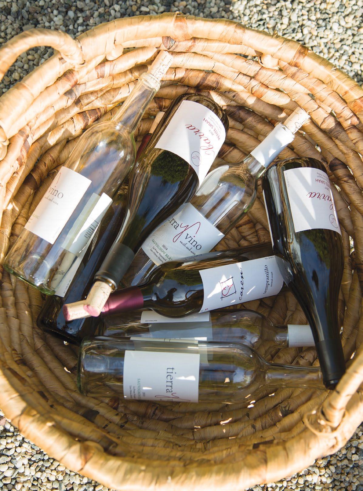 FROM TOP: Peppers and tomatillos are among the colorful, flavorful ingredients that highlight Rideau’s favorite dishes. Her new line of hand-painted Mexican pottery, developed with ceramicist Gorky Gonzalez, brightens a tabletop. OPPOSITE: A basket of empties signifies a successful session at the tasting room.