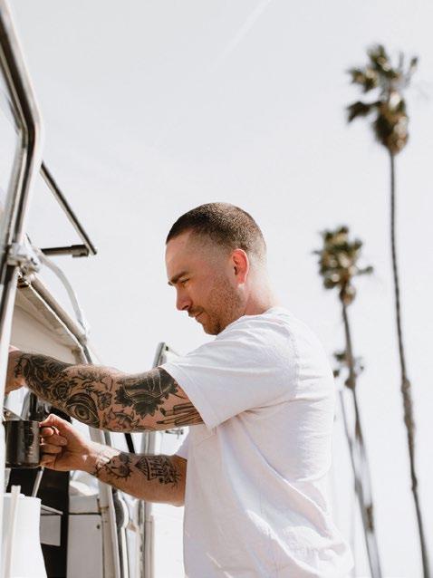 That Day in January (Santa Barbara Harbor adjacent, 2023) documents a 100-year swell that hit the West Coast in January 2023. The artist with some tools of the trade. OPPOSITE: October Sunrise (2021) depicts a perfect day in fall, when the swells have returned, the conditions are glassy, and the light is golden.