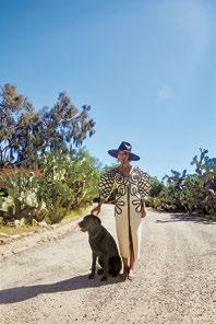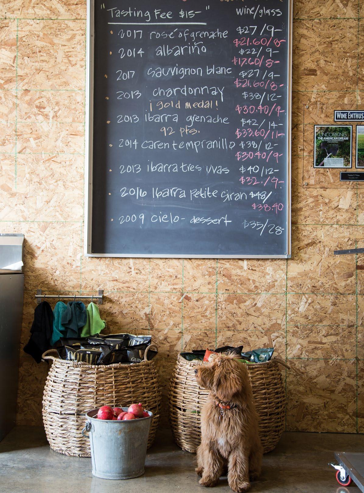 An artfully laid assortment of cheeses and olives invites patrons to sip and savor at the Tierra y Vino tasting room in Buellton. OPPOSITE: The winery’s co-owner, Caren Rideau (with her dog, Lola), in her Los Angeles home.