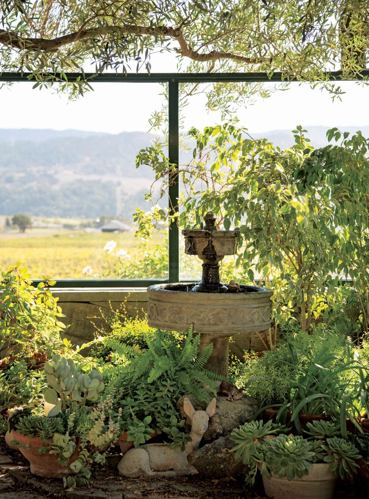 Decanting a red wine helps balance fresh tannins. OPPOSITE: Stillness in stone: A fountain and a fawn occupy a shady corner of a glassed-in dining enclosure at the La Presa Vineyard in Solvang.