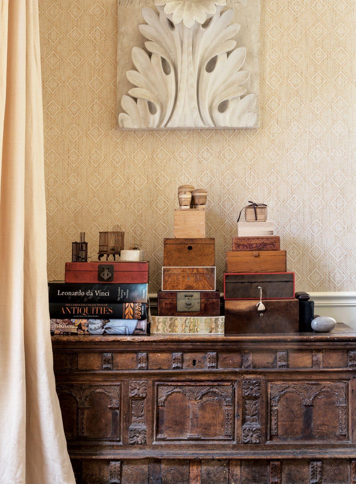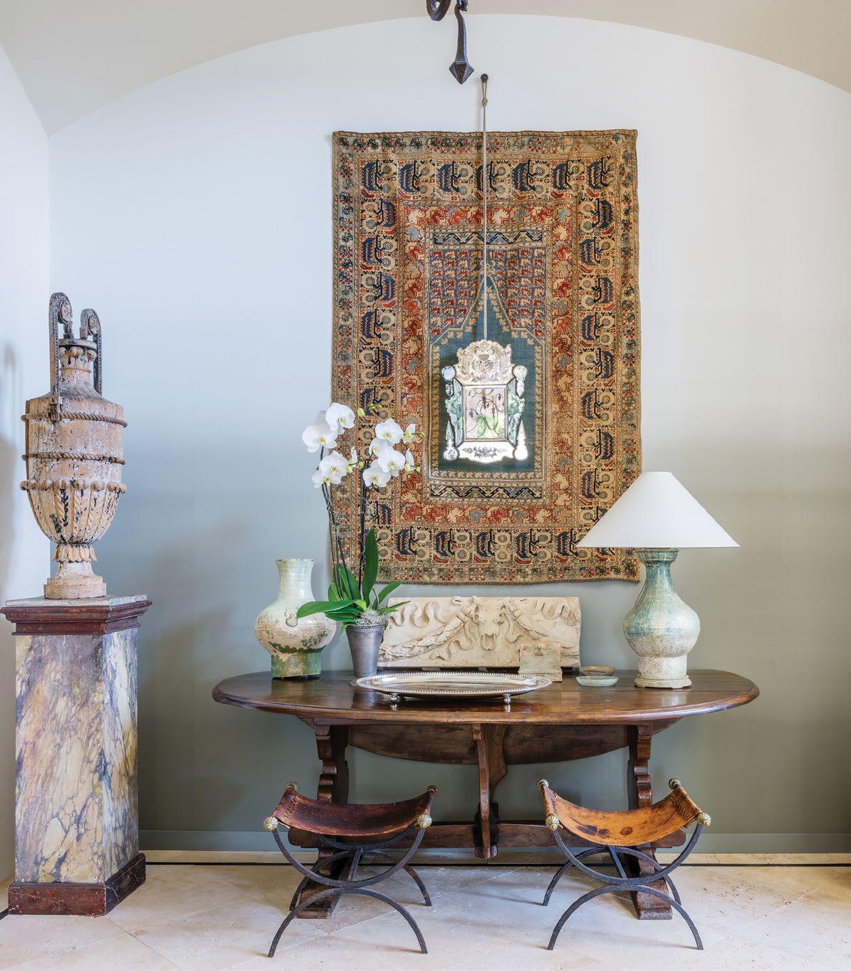 OPPOSITE: In the entryway, a wooden Neoclassical urn on a pedestal and an antique rug preside over a collection of treasures including a Roman fragment from a temple frieze and two small folding metal stools that resemble ancient Roman ones.