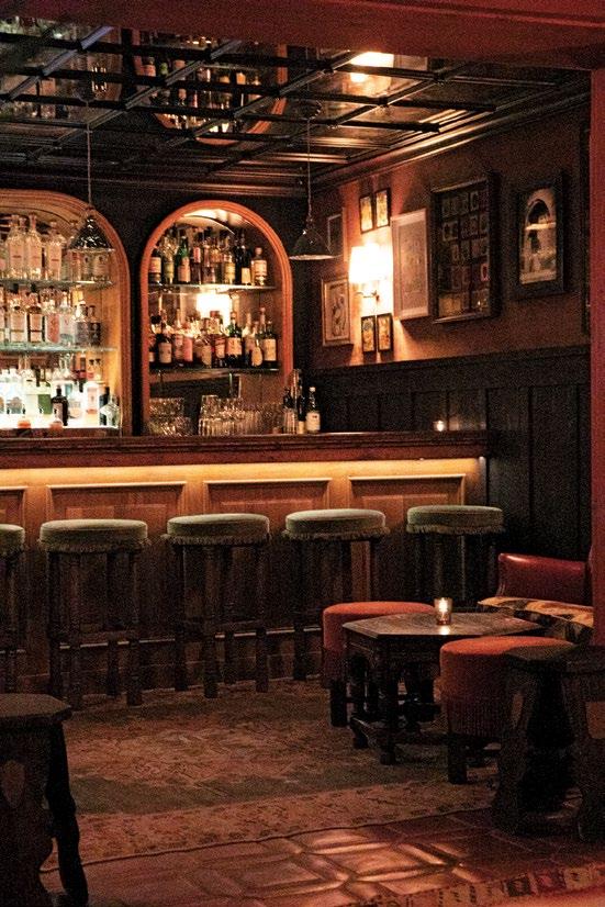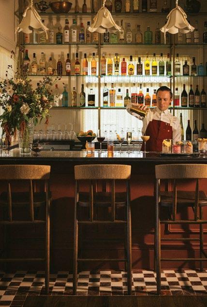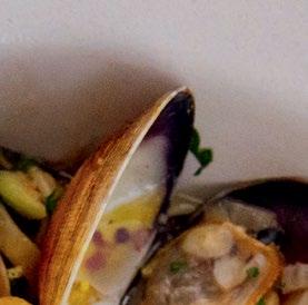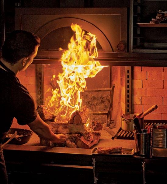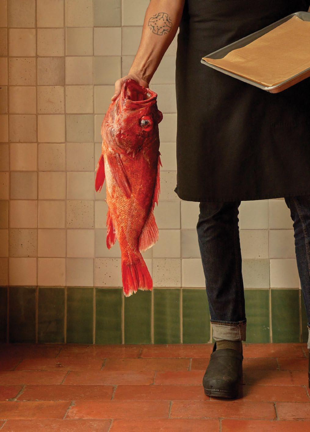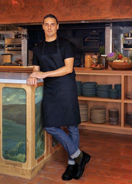 FROM TOP LEFT: The newly renovated bar at Little Mountain featuring lowintervention wine and spirit producers; chef Diego Moya; interiors by Andrew Cosbie; open fire cooking in the kitchen; the private dining room; dishes like preserved Hope Ranch mussels and summer squash celebrate local farmers and producers.