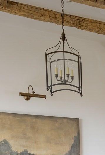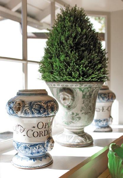 The great room captures the hallmarks of Saladino’s design aesthetic, a mixture of antique pieces and furniture of his own design. An ottoman covered with a 19th-century Persian silk tablcloth centers the room, on axis with Saladino’s Cromwell Settee Bench under the window. A fragment from Rome’s Baths of Caraculla is suspended high above the fireplace. WRITTEN BY LORIE DEWHIRST PORTER PHOTOGRAPHS BY FIROOZ ZAHEDI