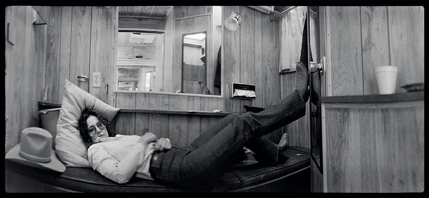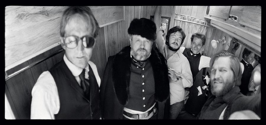FILMED IN 1979, HEAVEN’S GATE WAS A FICTIONALIZED VERSION OF THE JOHNSON COUNTY WAR, AND ITS SETS AND COSTUMES RECREATED THE WYOMING OF THE 1890S. FROM TOP : Between takes, cast members T Bone Burnett, Ronnie Hawkins, Loyd Catlett, Willem Dafoe, and Jeff Bridges enjoy downtime in a trailer; Susan Bridges contemplates the landscape of Montana, where much of the filming actually took place; producer Joann Carelli finds a moment to stretch out.