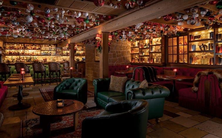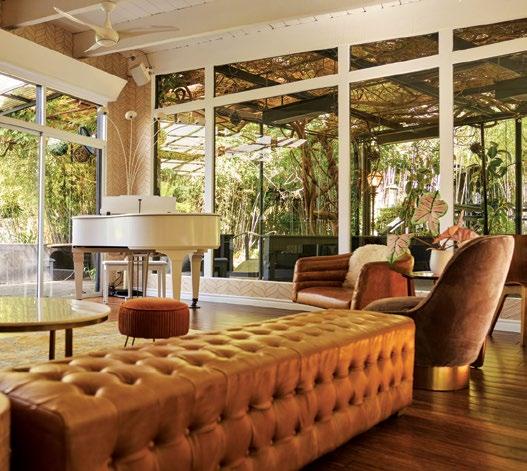 CLOCKWISE FROM TOP LEFT: A cozy corner in Ojai’s reimagined Hotel El Roblar; live fire cooking continues a theme throughout the property’s spaces; the lobby Snug Bar.