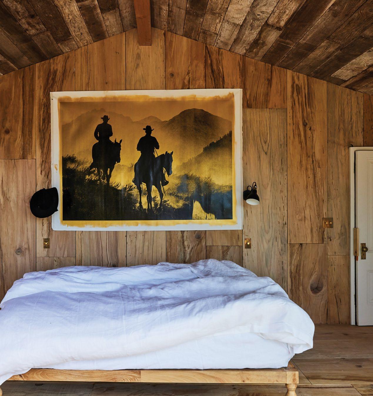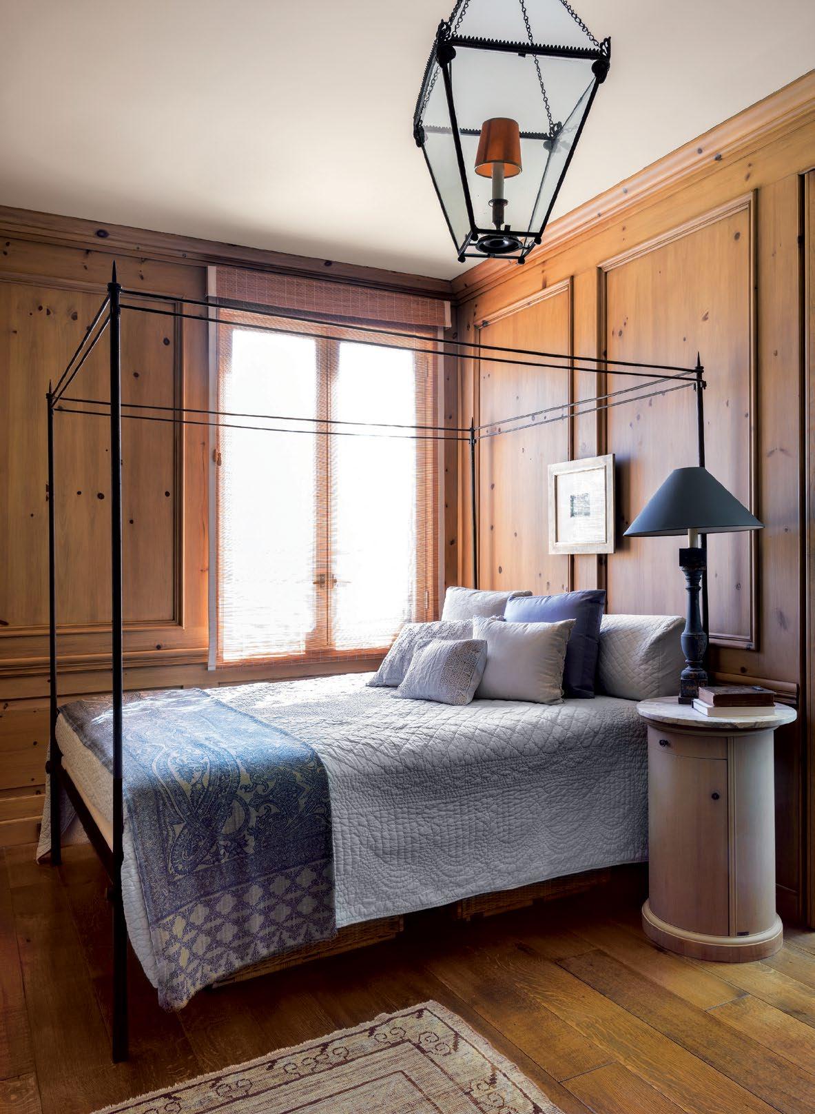 A giant 19th-century plaster acanthus leaf relief (formerly used to instruct students from the Beaux-Arts school at the French Academy) is centered over an Italian carved marriage chest that hosts a curated display of treasured objects, including cricket cages from Japan and antique wood boxes. OPPOSITE: The minimalist guest bedroom is a study in serene geometry with honey-colored wood paneling and an 18th-century Italian officer’s campaign bed made of handforged steel.