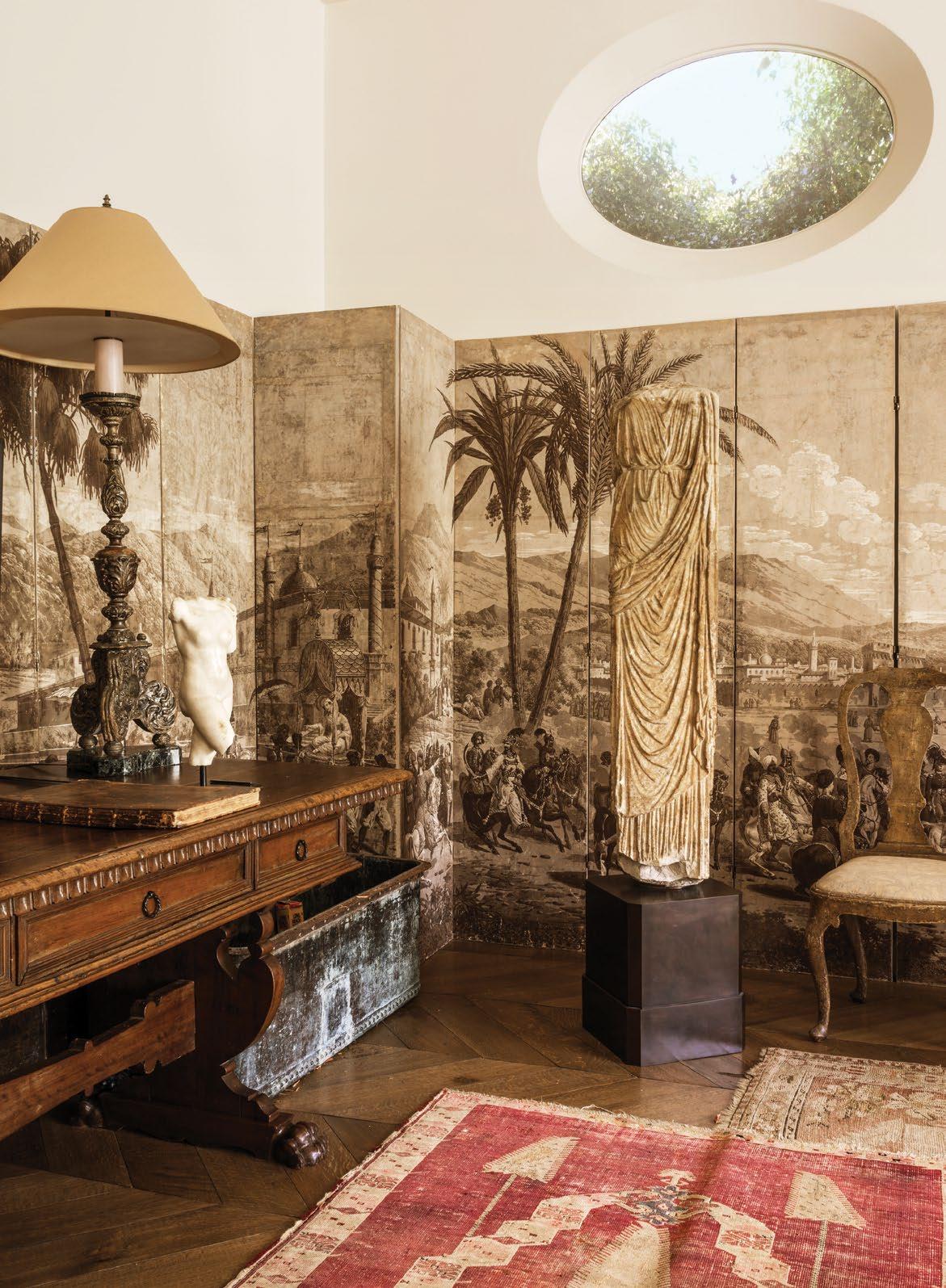 folding screen covered in 19th-century Zuber grisaille wallpaper provides a dramatic backdrop for the designer’s ancient marble herm sculpture.