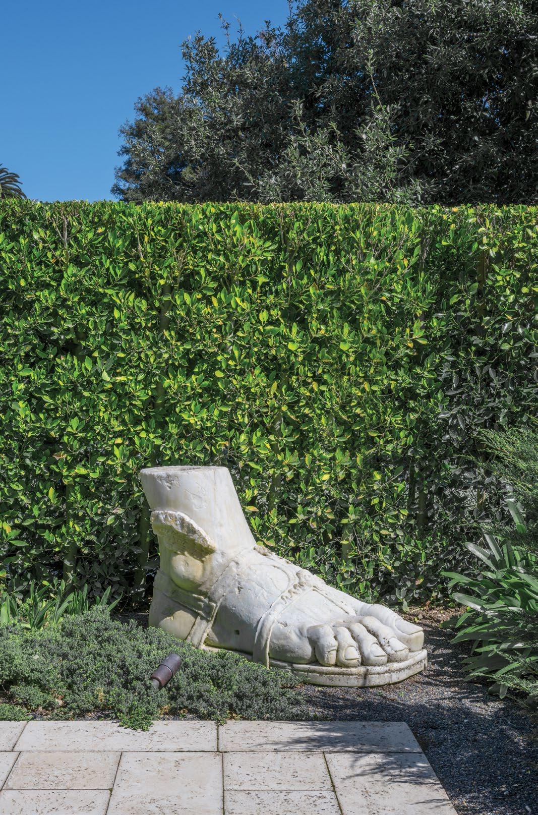 OPPOSITE: The walled portion of the garden features a giant marble sculpture of the Roman god Mercury’s foot.