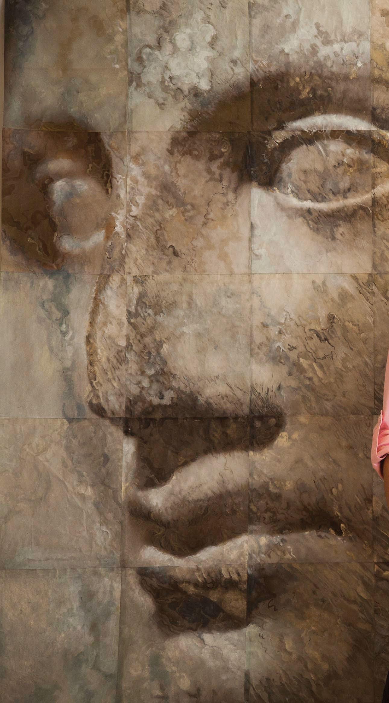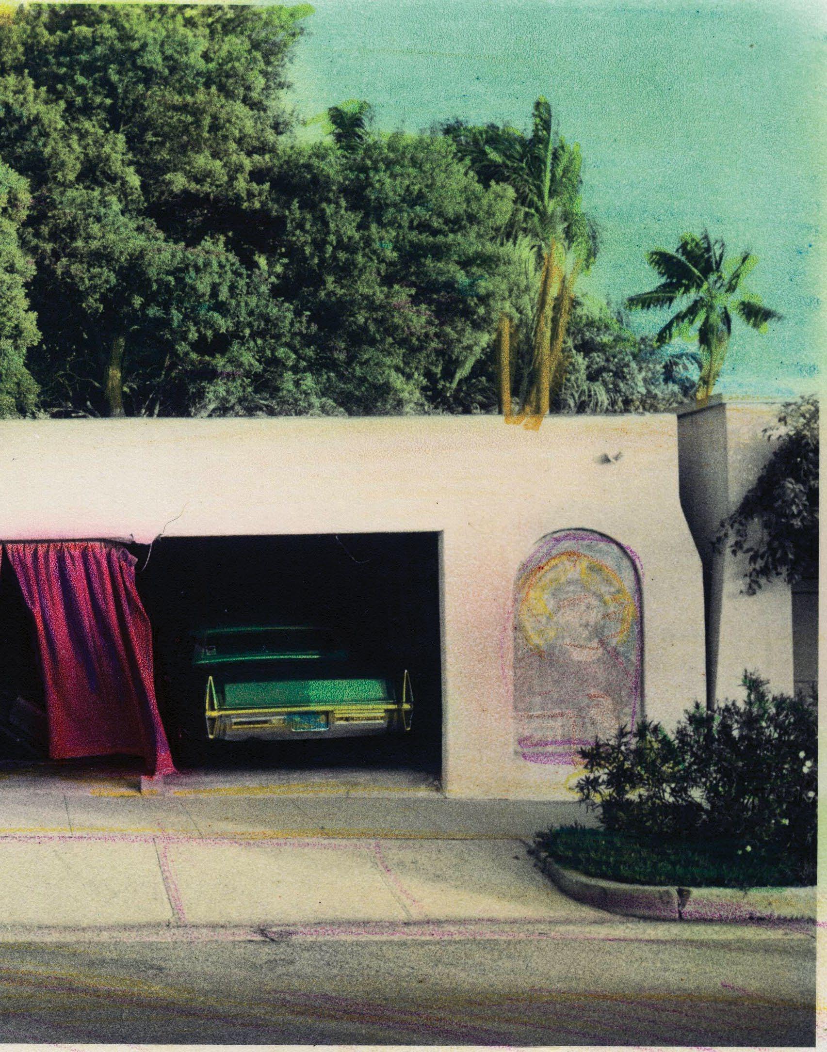 A vintage Cadillac and a religious icon at a house near the Santa Barbara Mission caught photographer Macduff Everton’s eye. OPPOSITE: Mary Heebner probed an ancient image in Geography of a Face: The Messenger, a grid collage from 2010.
