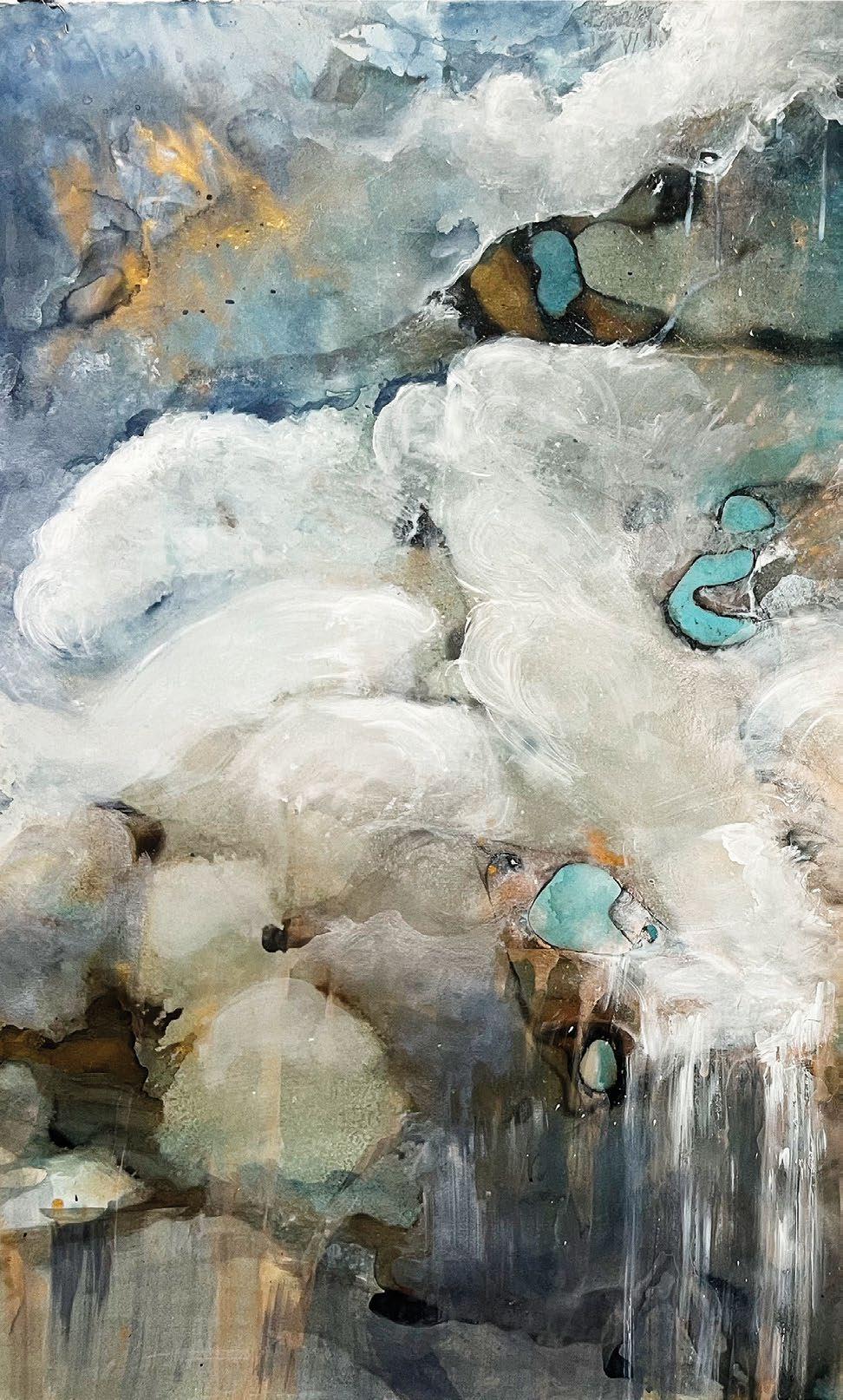 RIGHT AND OPPOSITE: Heebner’s paintings and collages exude feelings of rhythm and mystery—Water series: Blue Music Samba (2015) and Venus series: Night Venus (2014).