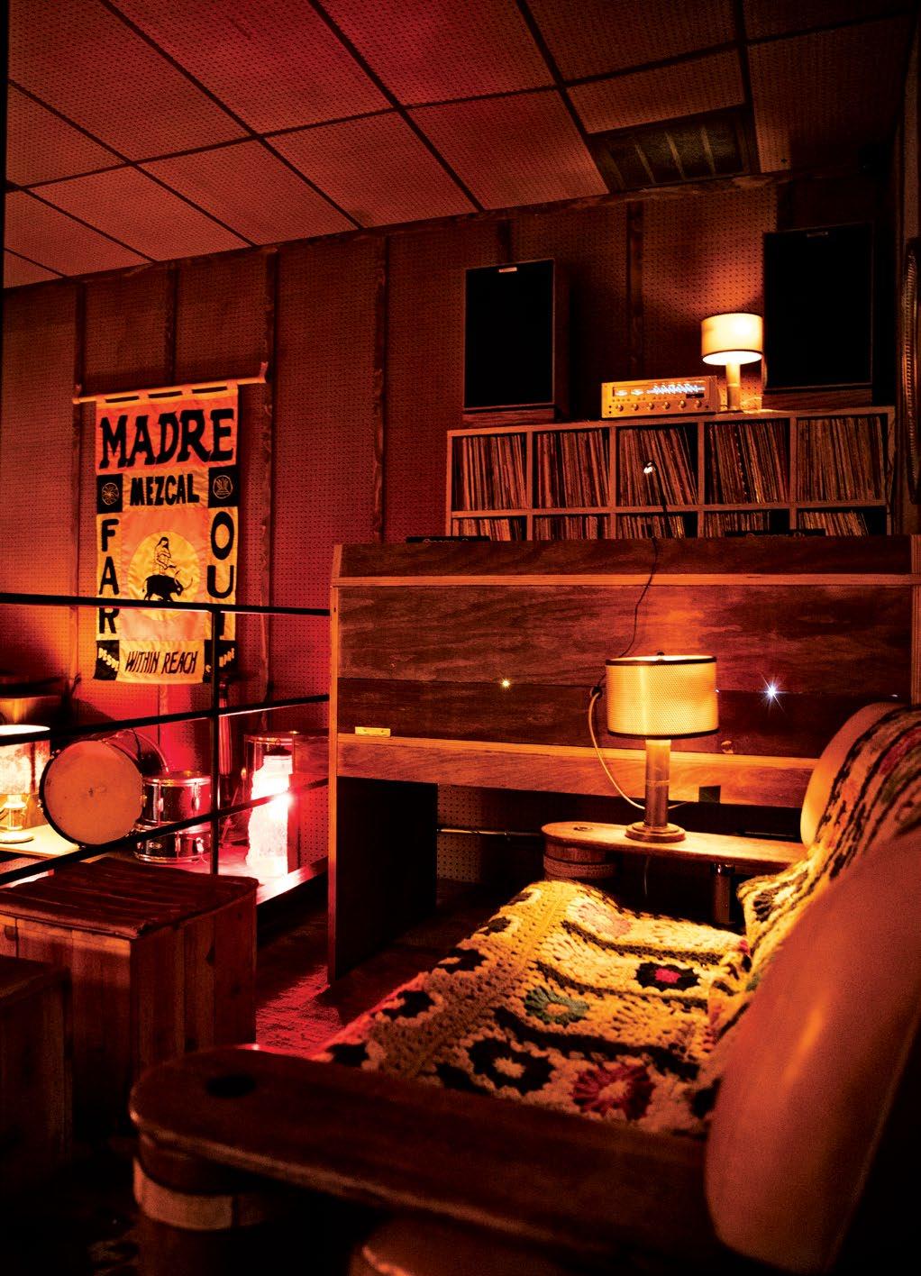CLOCKWISE: Come sundown in Ojai, the energy shifts from casual Taco Roma to the adjacent hi-fi lounge/mezcal bar Radio Roma; an intimate vignette; team members Madeline Hecox and Eva Penny; guest DJs take over the decks nightly; the bar.