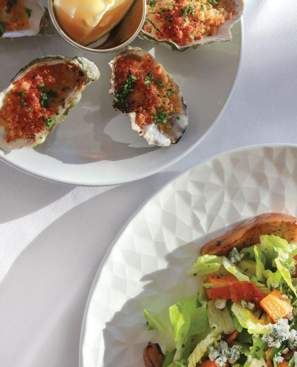 TOP LEFT: The terrace at the historic Ranch House; oysters with herb beurre blanc and crisped enoki mushrooms; a sampling of chef and co-owner Perfecte Rocher’s cookbook collection; Perfecte and Alia Rocher; the piano cocktail lounge.