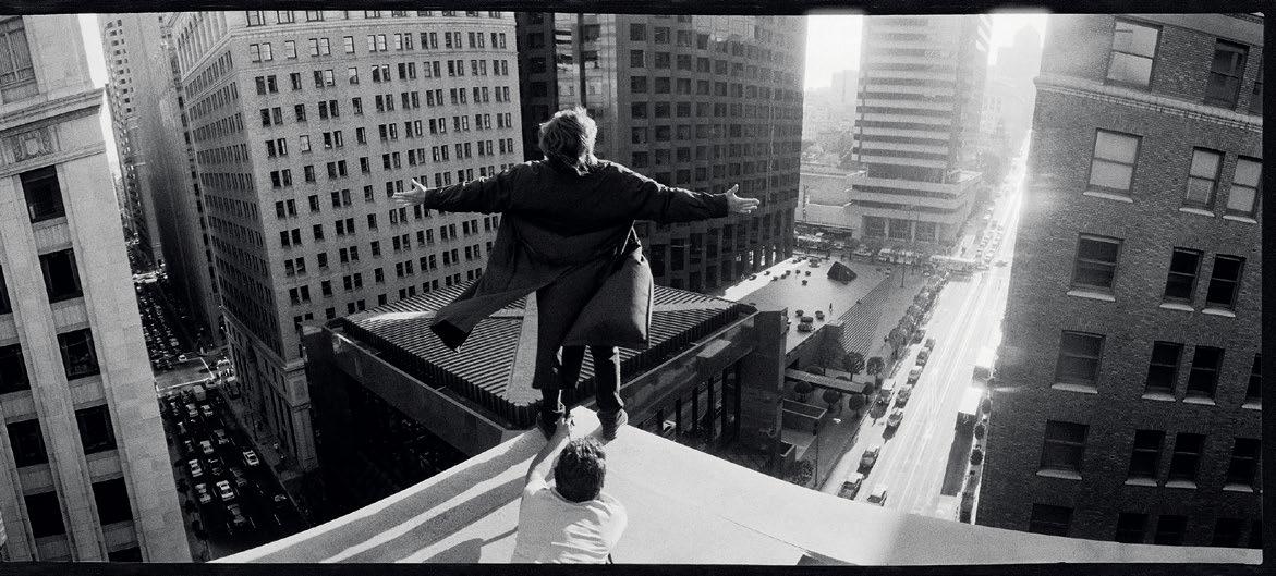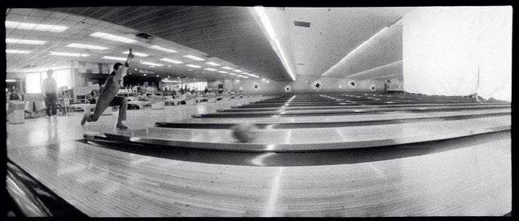 JEFF BRIDGES HAS FAVORED A WIDELUX PANORAMIC CAMERA FOR HIS PHOTOGRAPHY SINCE SUSAN GAVE HIM ONE AS A WEDDING GIFT. FROM TOP: He captures brother Beau getting ready for a scene in The Fabulous Baker Boys in 1989; John Turturro as Jesus Quintana hurls the ball down the bowling alley, which played a crucial role in The Big Lebowski in 1998; stunt actor Gilbert Combs is steadied on a roof in Fearless in 1993.