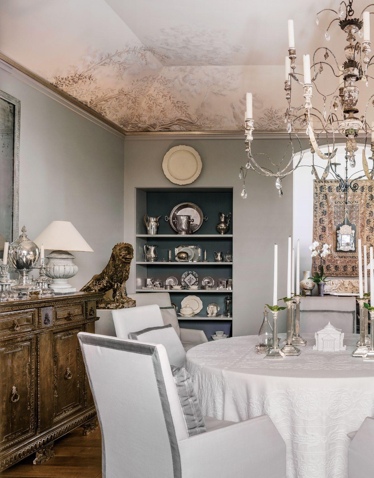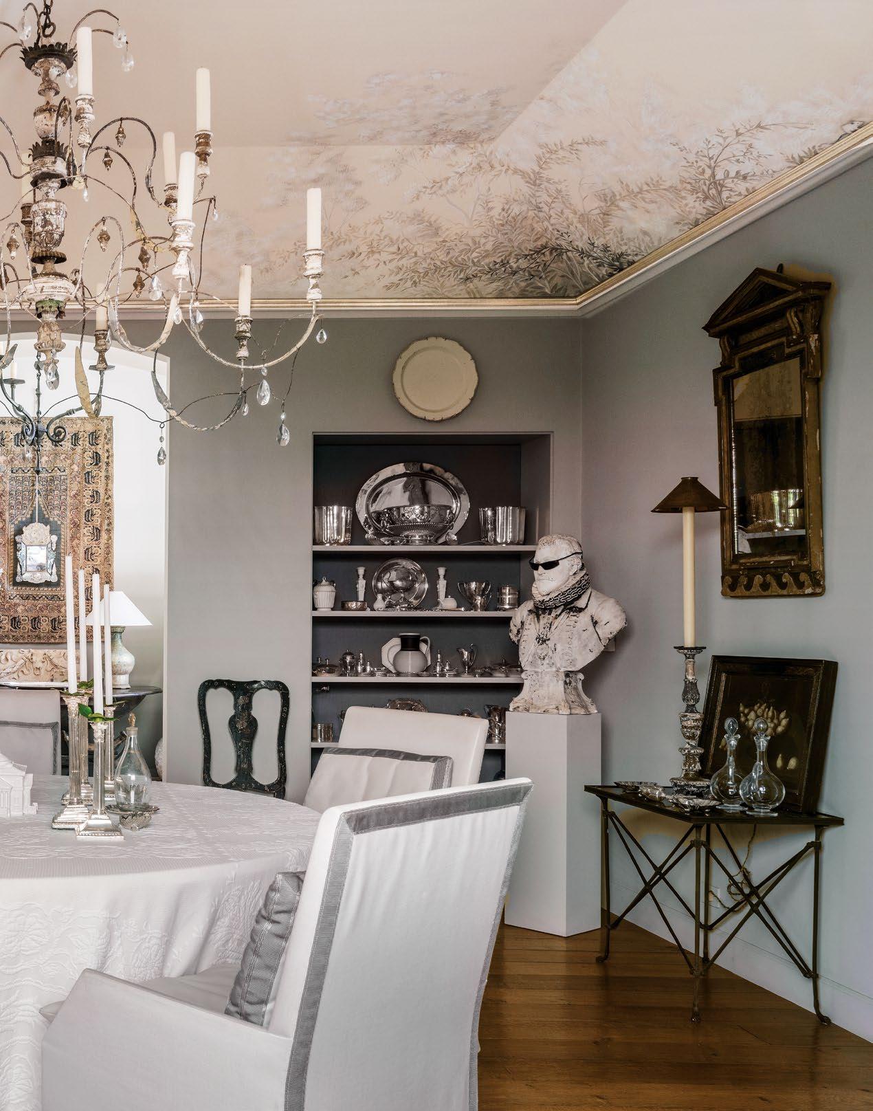 The dining room’s tray ceiling is embellished with delicate grisaille branches painted by local artist Colette Cosentino.