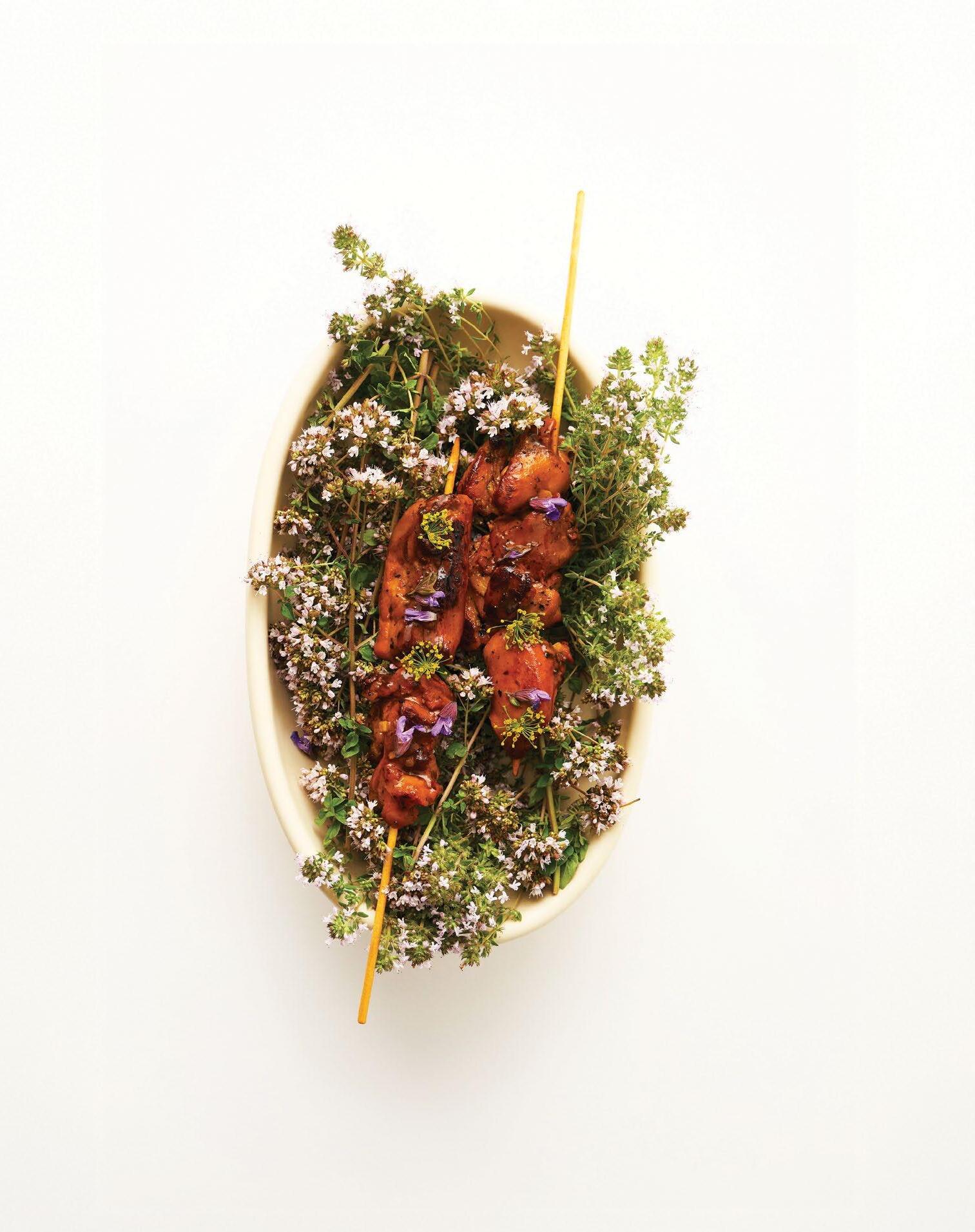 Charcoal-grilled chicken skewers served over flowering thyme is representative of the garden-focused ethos at the Rochers at the Ranch House in Ojai.