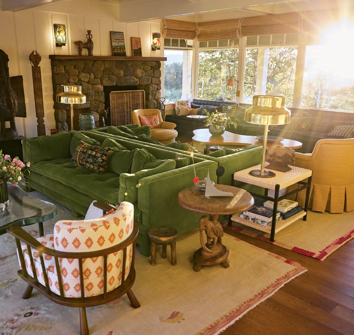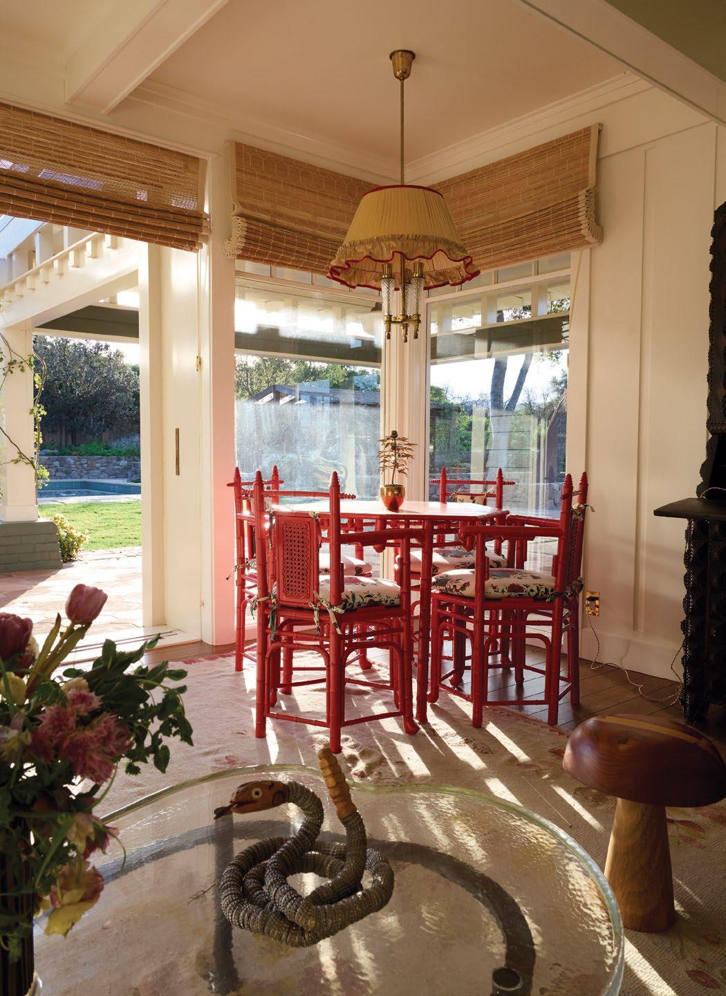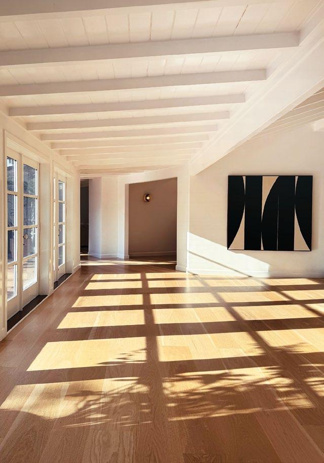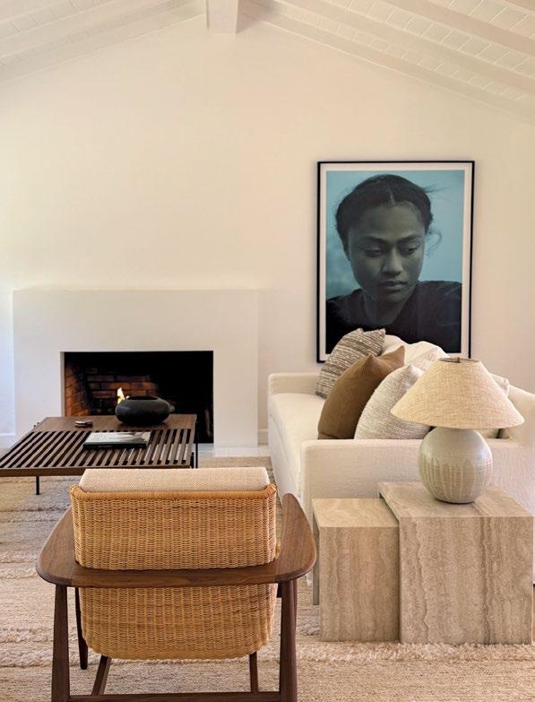 art, which she collects with assistance from Sadie Kirshman at The Pit gallery in Los Angeles. Coveted works include pieces by French photographer–street artist JR, Haitian American painter Patrick Eugène, and Canadian artist Annie Hémond Hotte, whose painting anchors the dining room. The circular dining table was inspired by a special dinner at the San Ysidro Ranch. “There were eight of us,” Ashley says, “and it was the perfect conversation. There weren’t any side conversations. I really like a round table; it encourages everybody to have one conversation.” Armed with a tape measure, she returned to the ranch the next day, and Madeline had the table custom made to those dimensions and then also designed the chairs. There’s only one catch, Ashley says: “Every time I have a dinner party, I’m like, Well, darn, I can only have eight people!” •