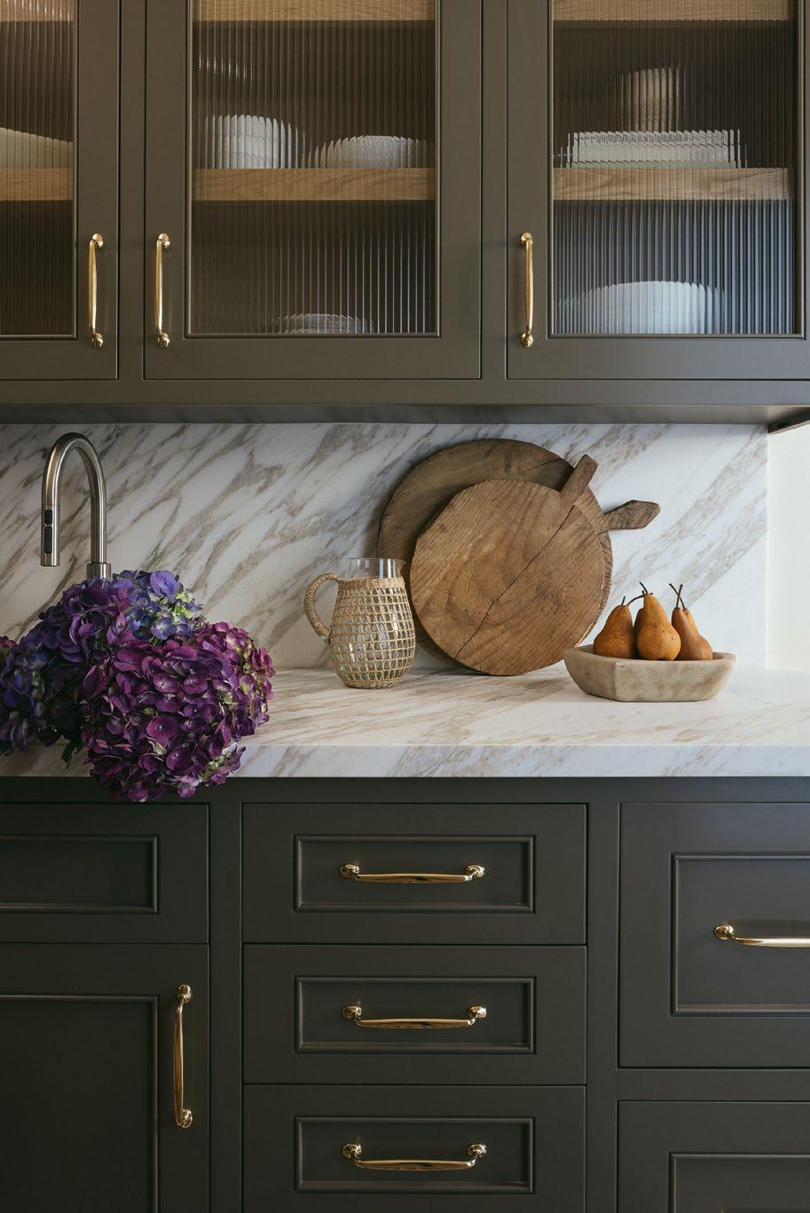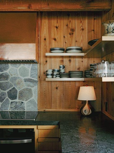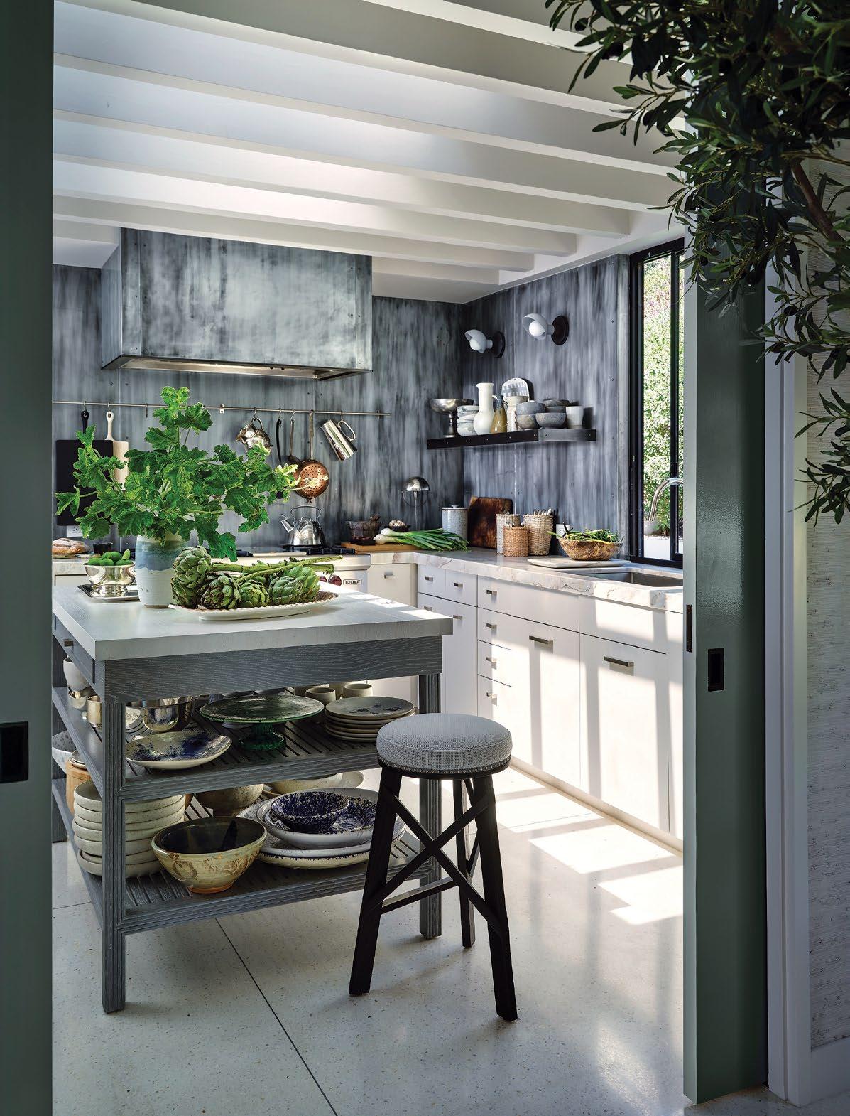 open, and we’re basically in the pool every afternoon when James gets home from school.” To keep the kitchen from looking too stark, Marks worked with a metal fabricator to create the culinary epicenter’s “wonderfully patinated” zinc walls, shelving, and backsplash, which make the space feel a bit edgier than a typically pristine kitchen. “We’re not great chefs, but we do spend a lot of time here, so I wanted something a little more playful and different.”