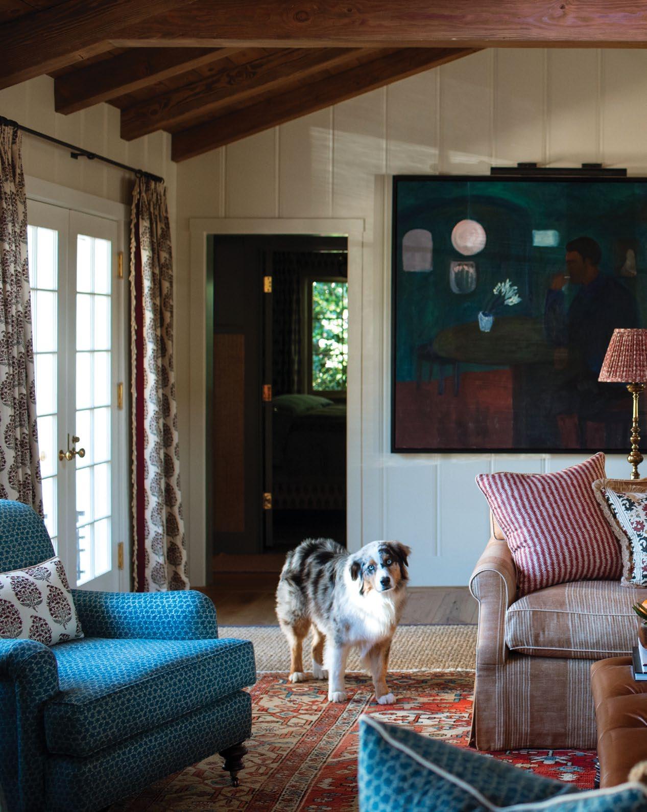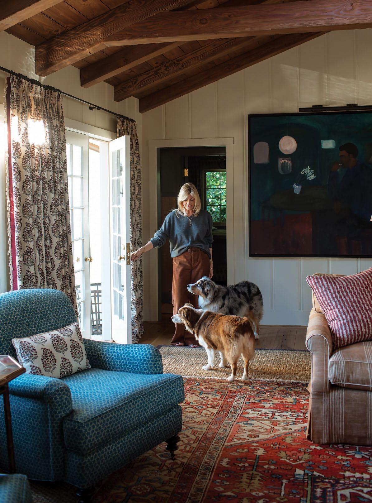 In the meantime, Ashley and her husband are enjoying their comfy Hedgerow home along with their two Australian shepherds, Bernie and Rosie. The private wing of the house boasts several bedrooms, including Ashley’s favorite, which is decked out with colorful fabrics by British designer Robert Kime. “I really wanted that English look,” Ashley says, “where you have the fabric on the walls and the curtains, the lampshades, and the headboard. This room is like a hug.”