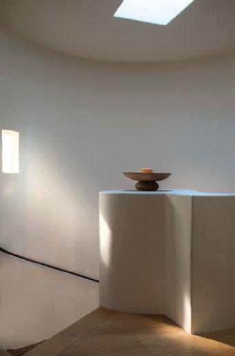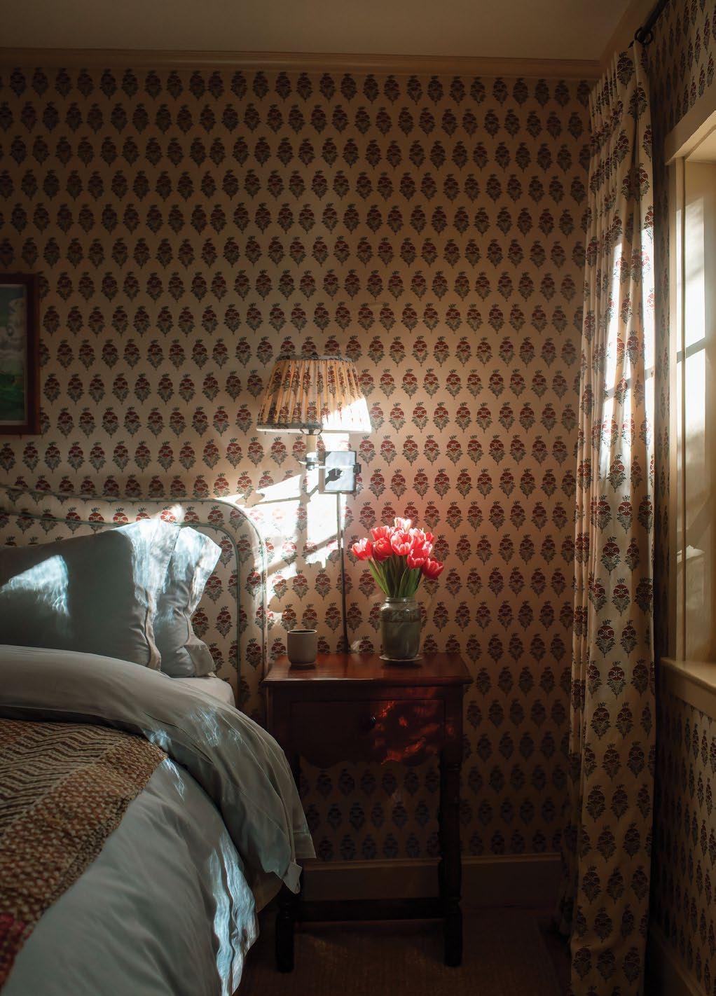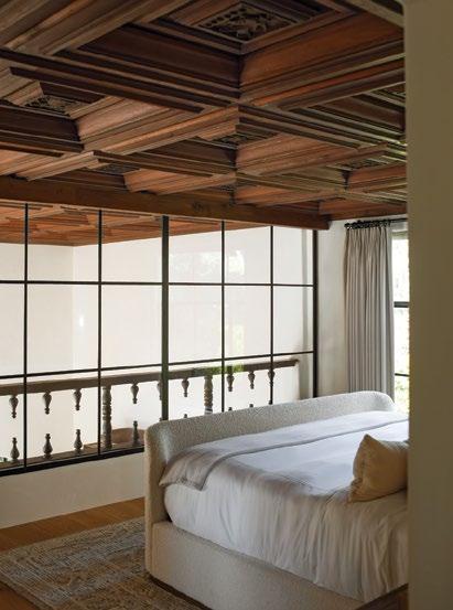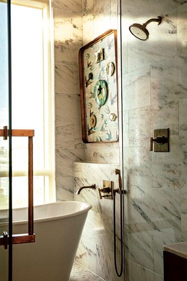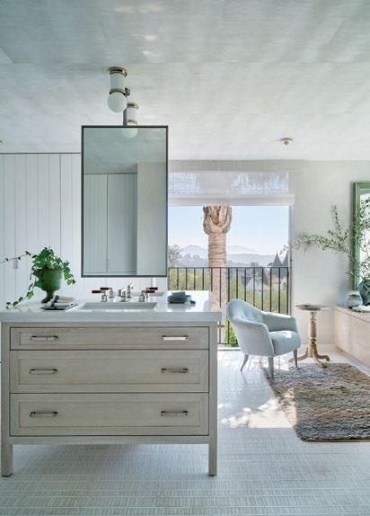 A peek into the airy spa-like primary bathroom and the couple’s cozy, welllayered bedroom.