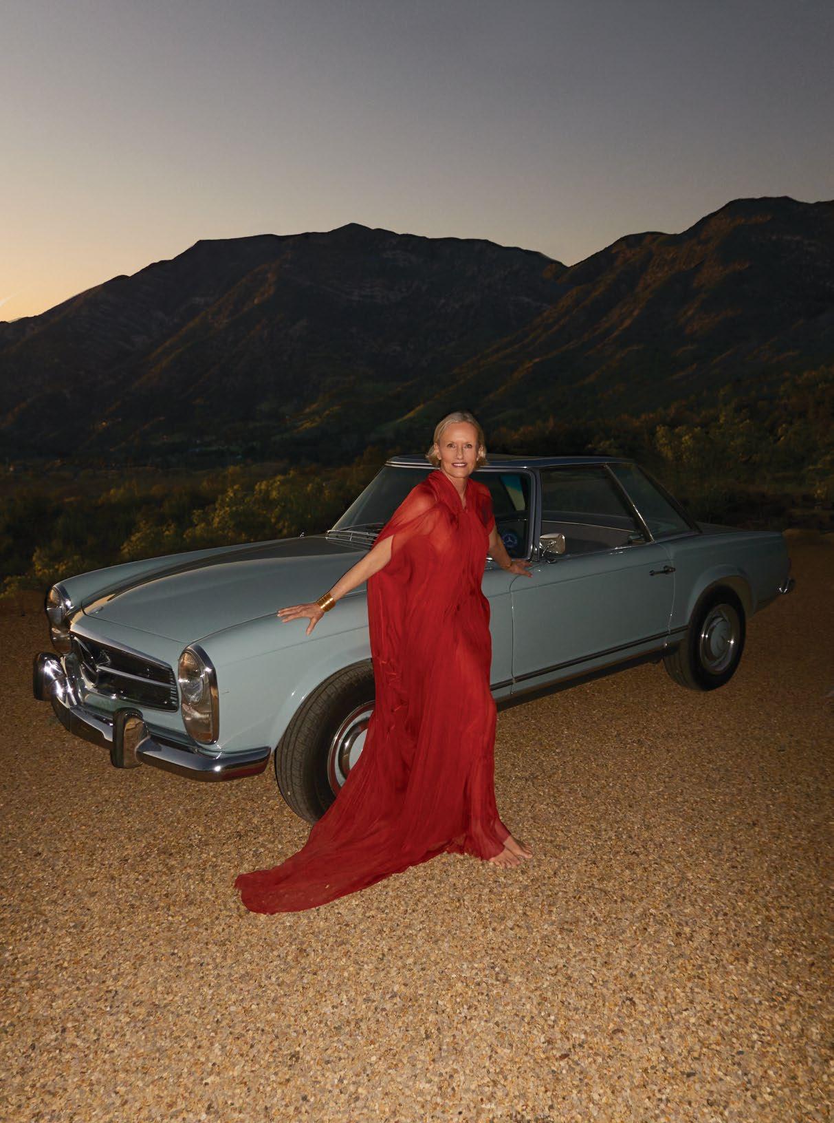 Anne Crawford and her vintage Mercedes in front of her Ojai home.
