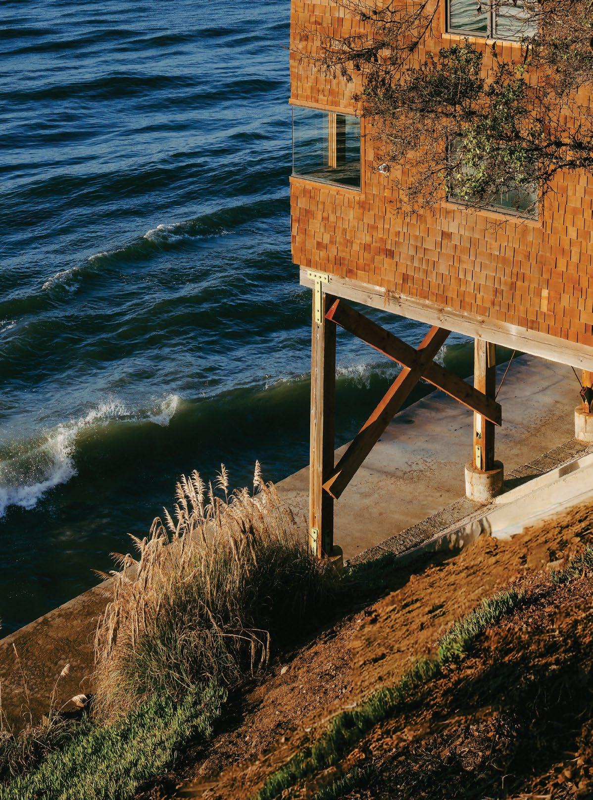 Stylistically, the design resembles 1970s funky chic with echoes of Northern California architecture common to the dwellings in Sea Ranch: dark wood-shingle exteriors and a generously fenestrated ocean-facing facade.