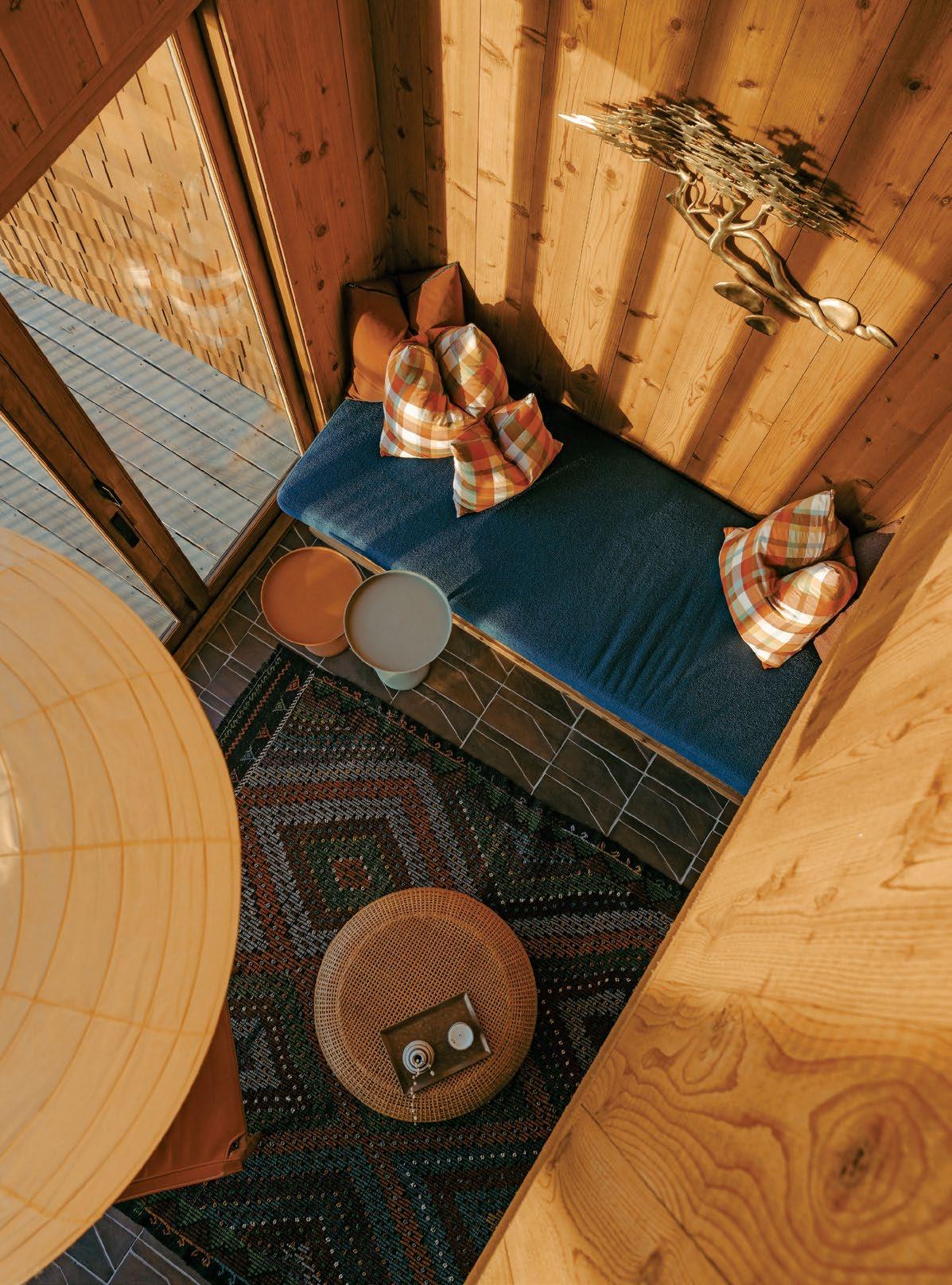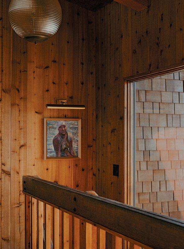 OPPOSITE: A detail of the wood-lined living room intersecting with a staircase leading to the second floor, with color provided by an organic abstract painting.
