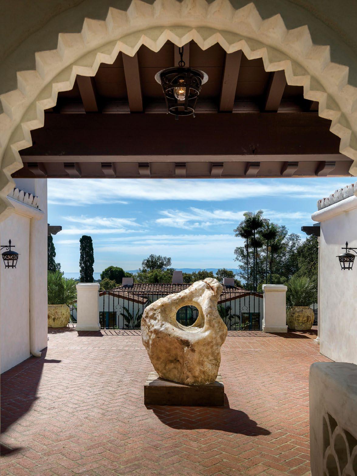Framed by a characteristic sawtooth arch in the home designed by Mary McLaughlin Craig, an abstract stone sculpture dominates its space on a terrace that looks out to the Pacific.