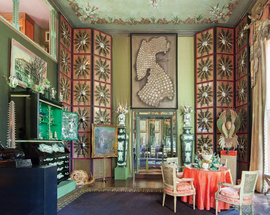 The designer collaborated with de Gournay to create Bohemian Jungle, a reflective foil wallpaper print cladding the sitting room walls. OPPOSITE: