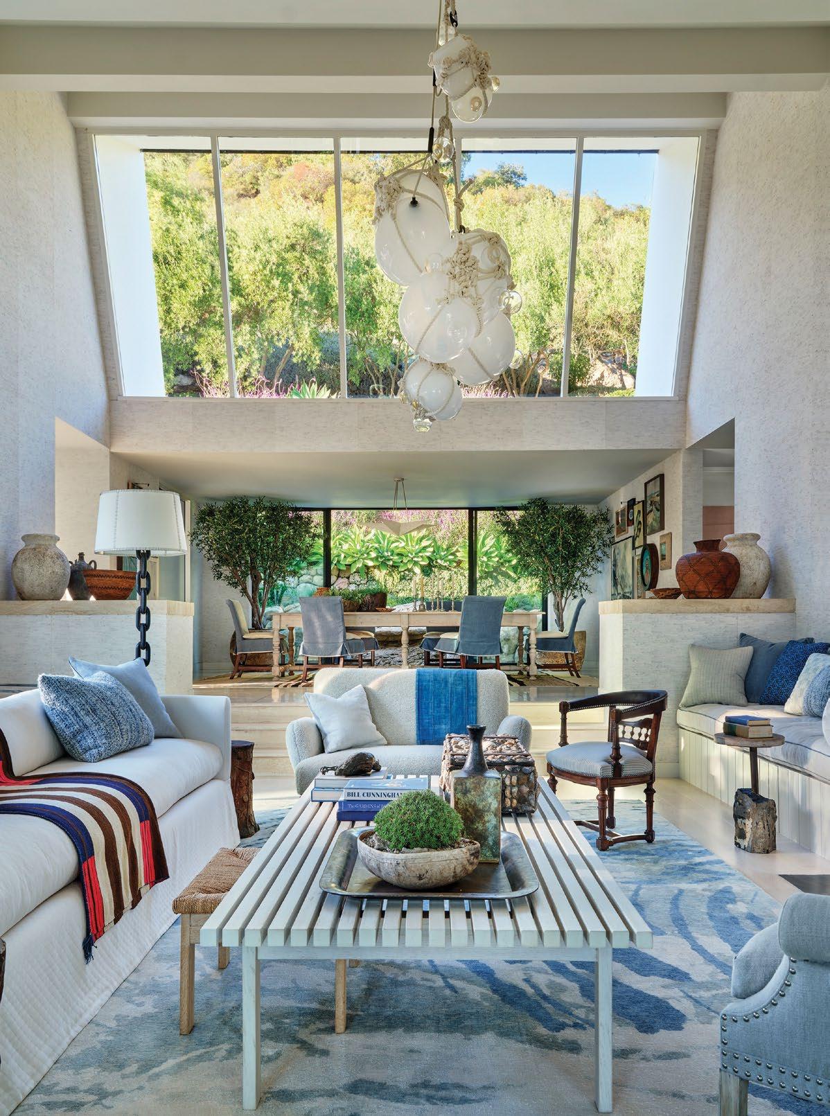 Light streams into the living and dining rooms through expansive clerestory windows. Favorite pieces here include Lindsey Adelman’s Knotty Bubbles chandelier, a Charlotte Perriand coffee table, an original Saladino Cape Sofa, and a wool-and-bamboo silk Windansea Cool rug from Marks’s collection with The Rug Company.