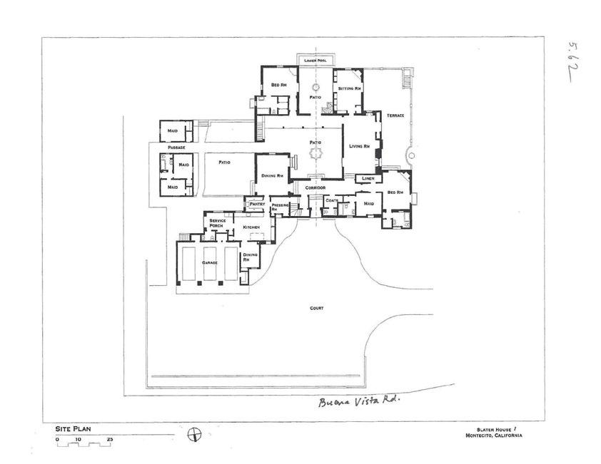 In 1927 Mary was commissioned by Mrs. William A. Slater to build a house for herself and her son on Buena Vista Drive in Montecito. Her design featured an axis that led from the main entrance through two patios—one in the center of the home and the other overlooking a pool and the ocean beyond. The living room and dining room were on