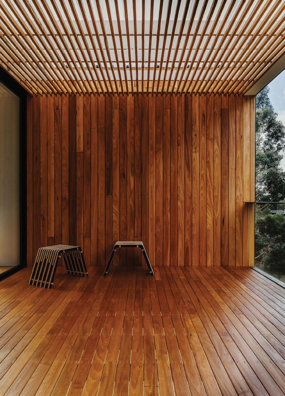 The upstairs atelier showcases the contrast of cedar interior walls and the shingled exterior.
