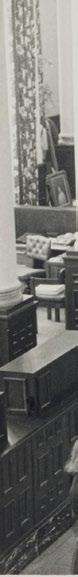 A restored wooden door, originally imported from Portugal, opens to a view of the office. OPPOSITE, FROM LEFT: The floor plan of the Slater House; in a vintage photo, an ornate wooden grille casts shadows at an entrance to an interior patio.