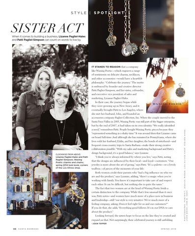 like Waxing Poetic—which engraves a range of sentiments on delicate charms, necklaces, and other accessories—would have a heartfelt philosophy: “Celebrate the journey.” The motto is embraced by founder and creative director Patti Pagliei-Simpson, and her sister, cofounder, and executive vice president of sales and marketing, Lizanne Pagliei-Hales. In their case, the journey began while they were growing up in New Jersey, and it eventually brought Patti to Los Angeles, where she met her husband, John, and founded an accessories company Pagliei Collection, Inc. When the couple moved to the Santa Ynez Valley in 2005, Waxing Poetic was still part of the bigger enterprise, a need,” remembers Patti. People bought Waxing Poetic pieces because they “represented something in a shaky time.” It was around then that Lizanne came on board full-time. And although she has remained in Pennsylvania, where she lives with her husband, Eddie, and her daughter, the bonds of sisterhood—and frequent cross-country trips to Santa Barbara—make their strong creative collaboration possible. “With my sales and marketing background and Patti’s CLOCKWISE FROM ABOVE : Lizanne Pagliei-Hales and Patti Pagliei-Simpson; Waxing Poetic charms and chains; spring 2014 look book; corners of the Los Olivos shop.