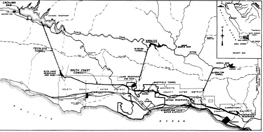 By 1937 the water sitch had deteriorated to the point that the SB County Supervisors hired an engineering firm to see what would happen if we dammed the Santa Ynez River in order to create a water catchment; what non-hydrologists call a lake. Just broaching the idea caused some hell to break loose. By the late ‘40s people on both sides of the issue were up in arms. One post-WWII worry was that a big artificial lake just sitting there in the Santa Ynez Valley would be an irresistible target for an enemy atom bomb, whose demonstrably large explosion would “wash all the people and livestock downstream into the Pacific Ocean.” This homespun concern slightly misapprehends the chief downsides of a nuclear cataclysm. Other hollered objections were that capturing and distributing the water smacked of Socialism (see ill-advised opening lines of this essay), and that Santa Barbarans would be footing a bill that would mostly benefit farmers in Goleta and Carpinteria. Following much discursive to-and-fro, the seven-year drought and severe water