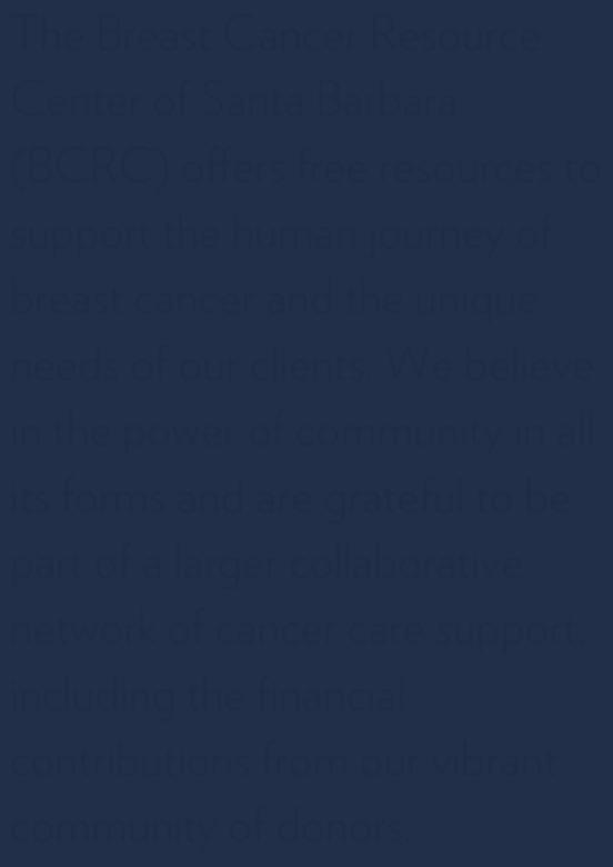 The Breast Cancer Resource Center of Santa Barbara (BCRC) offers free resources to support the human journey of breast cancer and the unique needs of our clients. We believe in the power of community in all its forms and are grateful to be part of a larger collaborative network of cancer care support, including the financial contributions from our vibrant community of donors.