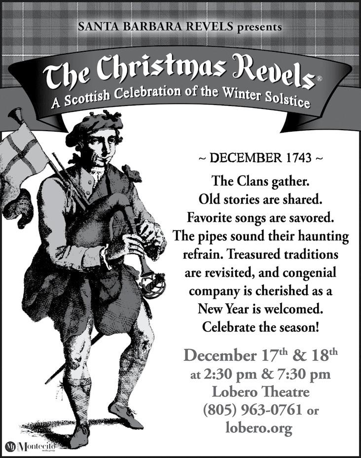 Highlands for the Holidays – Santa Barbara Revels’ 15th annual production serves up A Scottish Celebration of the Winter Solstice set in the Highlands of Scotland in the mid-1700s – during the time of the American TV drama Outlander – when the Scots resisted the influence and rule of England. Neighbors are gathering at the local laird’s great manor house to celebrate Hogmanay, the Scottish New Year, and conflicts surface as the clans converge, then resolve into celebration when people begin singing, dancing together, raising a glass, and telling traditional stories, morphing into the sharing of good feelings and good times. The Christmas Revels changes setting and centuries each year and this year’s show is a sharply angled successor to 2021’s popular presentation of celebrating solstice Early California-style. But many of the community’s favorite Revels actors are back, including Bill Egan as the Laird, James McCarthy as the much-reviled Magistrate, and Meredith McMinn as the Storyteller, with Tyler X Koontz and Matthew Weitzel portraying rival clansmen. This year’s special guests include San Diego’s Beret Dernbach, who has won two Highland Dancing World Championships in Scotland and holds multiple titles from American competitions, plus members of the Santa Barbara Sheriff Pipe and Drum Corps. Long-time Reveler Matt Tavianini stage directs, with musical direction by Revels newcomer Susan Lansing-Weller. And Revels’ clever catch phrase still applies: “Join us and be joyous!”